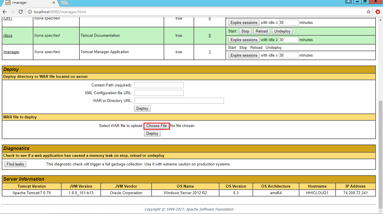 Click on the ‘Choose File’ button under heading ‘WAR file to deploy’ and select the OHT.war file that was provided in your Portal Builder setup.